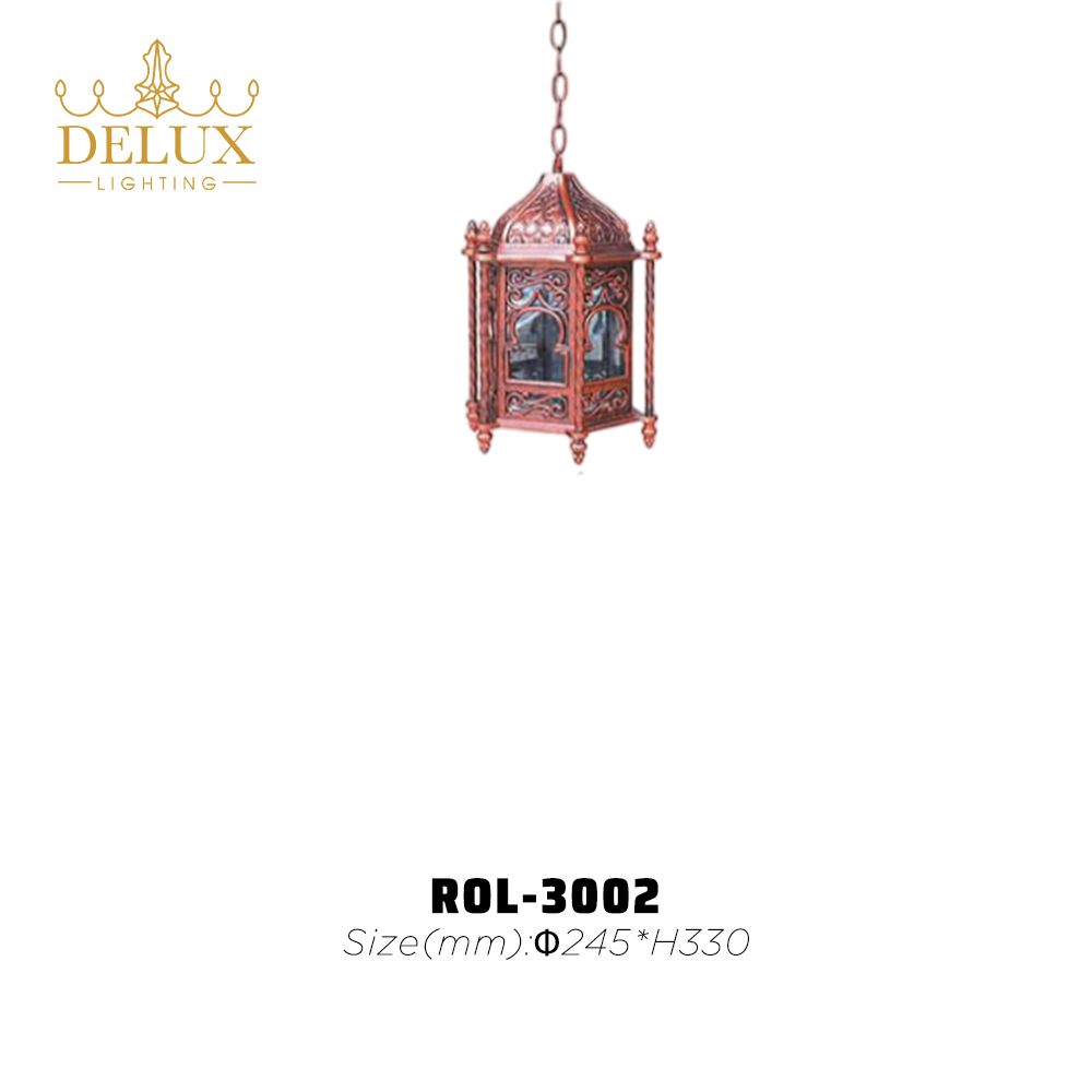 Vỏ đèn làm từ kim loại sơn giả cổ màu đồng đỏ, kết hợp cùng các mặt kính trong suốt với khung hoa văn hình vòm – gợi cảm giác cổ kính và sang trọng, đồng thời tạo nên hiệu ứng ánh sáng huyền ảo khi bật đèn. Đèn được treo bằng xích sắt chắc chắn, mang đến sự linh hoạt trong lắp đặt và điều chỉnh độ cao. ROL-3002 không chỉ là một thiết bị chiếu sáng, mà còn là điểm nhấn trang trí nghệ thuật, giúp không gian trở nên đậm chất văn hóa và cá tính hơn.